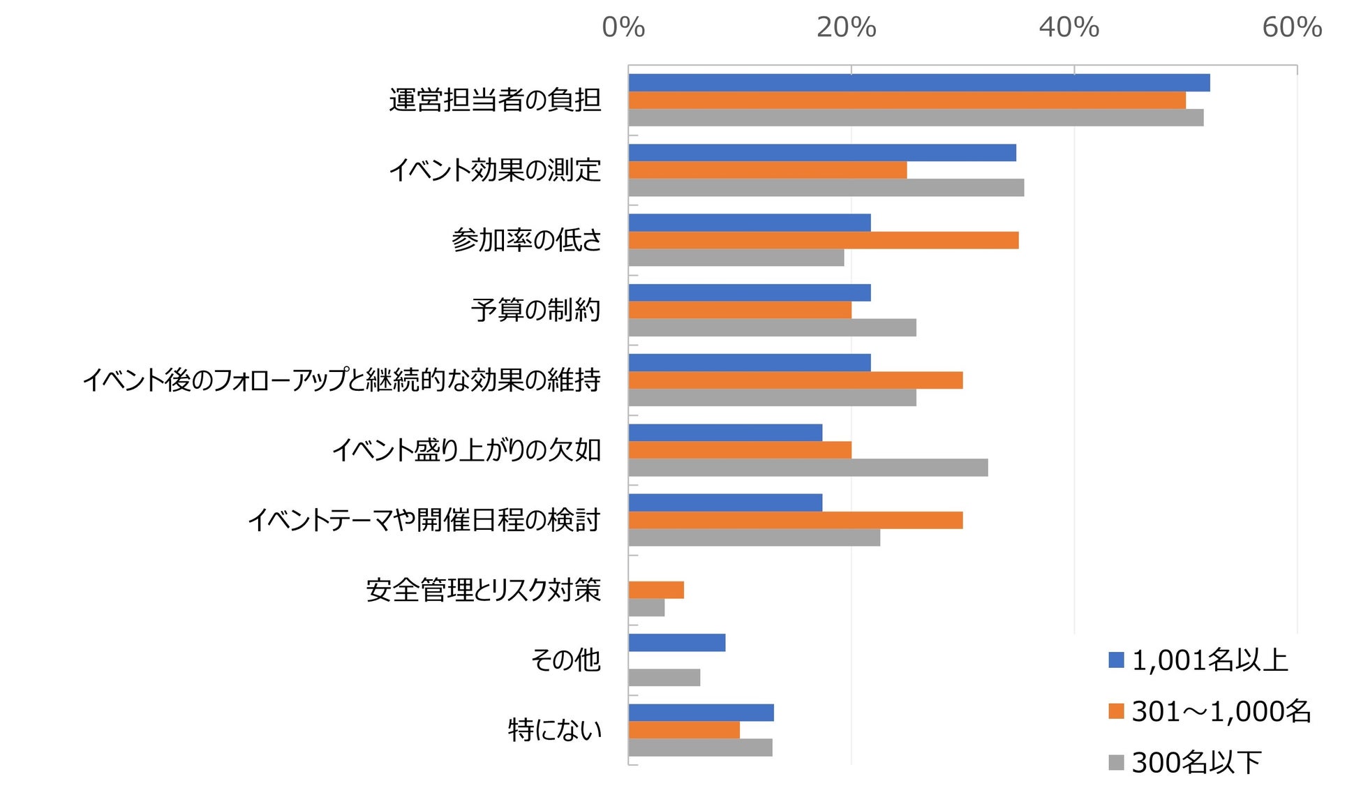 ・「運営担当者の負担」が全企業規模において半数程度で最多、「イベント効果の測定」も主要な課題(図表5)。