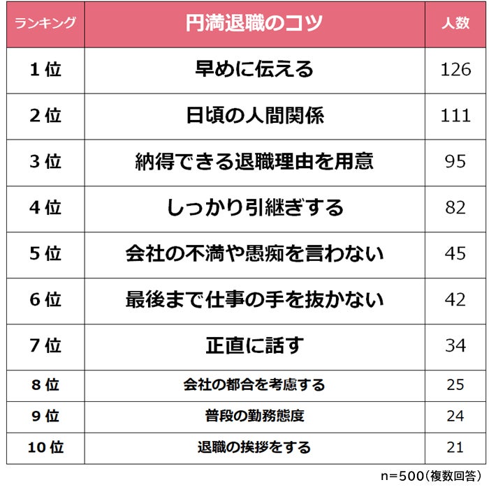 円満退職のコツを聞いたところ、第1位は「早めに伝える」となりました。