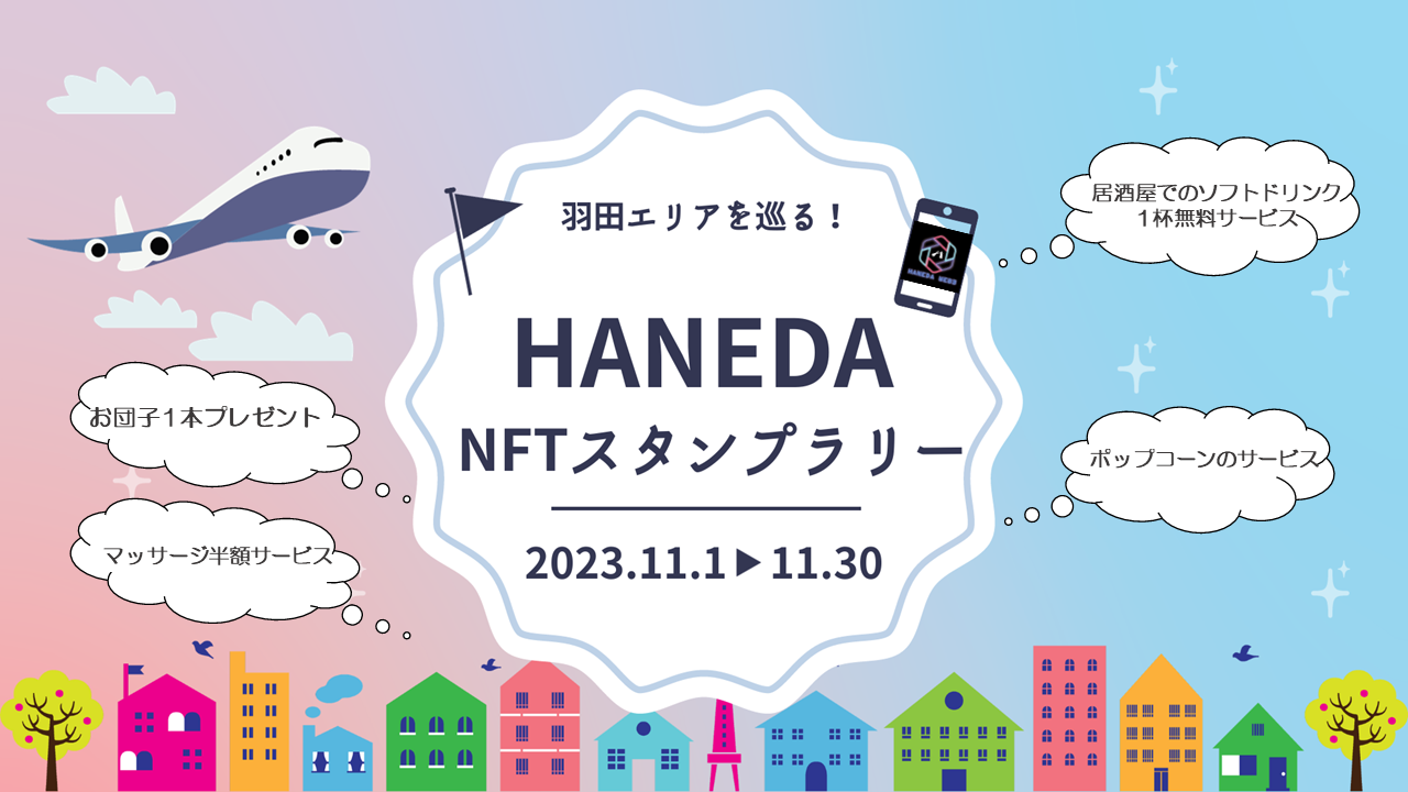 日本空港ビルデング株式会社のグループ会社である株式会社羽田未来総合研究所(東京都大田区、代表取締役社長執行役員 大西 洋、以下未来総研)は、2023年11月1日(水)から30日(木)の間、NFTを活用し、羽田空港・HANEDA INNOVATION CITY®・大田区商店街の店舗を繋ぐ「HANEDA NFT スタンプラリー」を初開催。11月17日(木)から開催の羽田空港発のテクノロジーの祭典「HANEDA EXPO」と連携したコンテンツの一つとして、スタンプラリーを通して、各エリアを繋ぐ新たな人流と商流創出を目指します。羽田空港内店舗、HANEDA INNOVATION CITY®内店舗や大田区商店街店舗の計17店舗と連携し、HANEDA NFTを見せるだけで、居酒屋でのソフトドリンク1杯無料サービス、お買い上げの方にポップコーンのサービス、ミニクラフトビールプレゼント等の特典や割引特典が受けることができます。また、各店舗で取得できるNFTスタンプを4つ集めることで、HANEDA EXPOオリジナルグッズが先着で応募できるスタンプラリーを実施します。