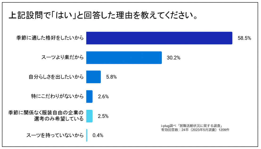 リクルートスーツ以外で就活をしたい理由として、最多の58.5%の学生が「季節に適した格好をしたいから」と回答しました。次いで「スーツより楽だから」が30.2%。