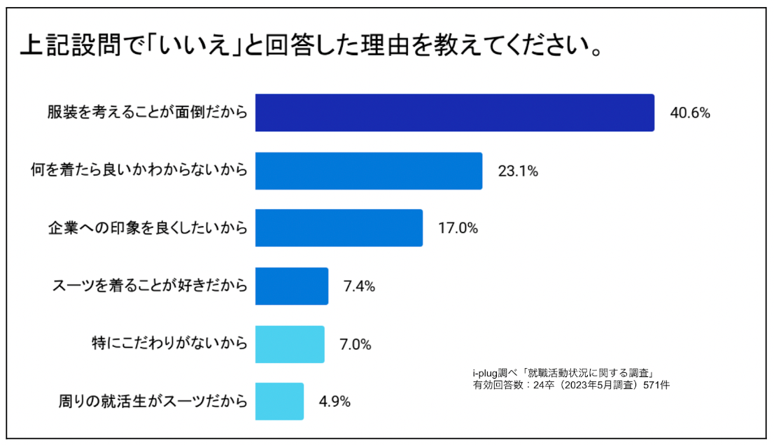 夏期もリクルートスーツで就活をしたい理由として最多の回答が「服装を考えることが面倒だから」でした。続いて、「何を着たら良いかわからないから」が23.1%。最適な格好がわからないことが、リクルートスーツを希望する理由であることがわかります。