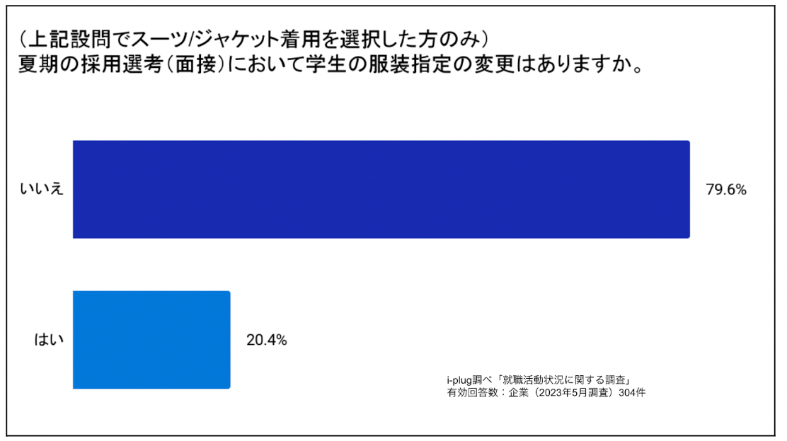 上記の設問で「スーツ」または「ジャケット着用」と回答した企業へ、下記の服装指定の有無を伺うと、79.6%が「いいえ」と回答。Q1の結果から「夏期はリクルートスーツ以外で就活をしたい」と回答した学生が多いことがわかった一方で、「夏期の服装指定を変更する」と回答した企業はわずか2割。学生の希望と企業の意向にギャップがあることがわかりました。