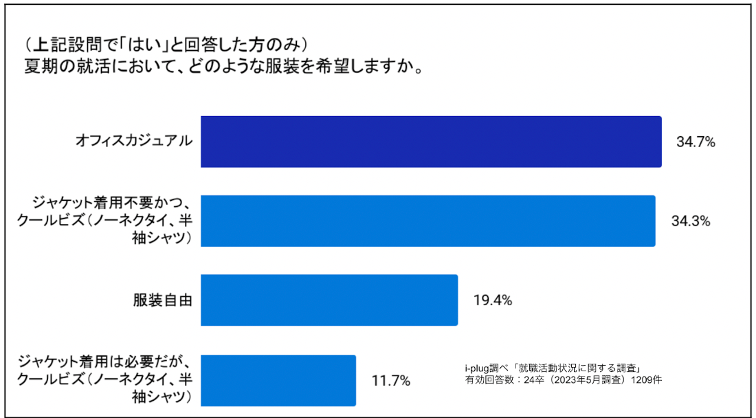 リクルートスーツ以外で就活をしたいと回答した学生に希望する服装を伺いました。「オフィスカジュアル」が最多の34.7%。次いで「ジャケット着用不要、かつクールビズ」が34.3%でした。
