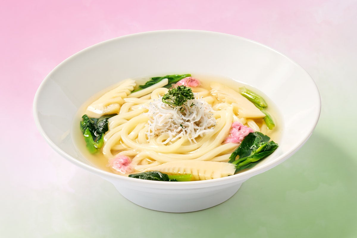 もっちりとしたうどんに絡みつく優しいとろみのあんには、季節を感じる桜・筍・菜の花の春食材と、ふんわり釜揚げしらすを入れました。
