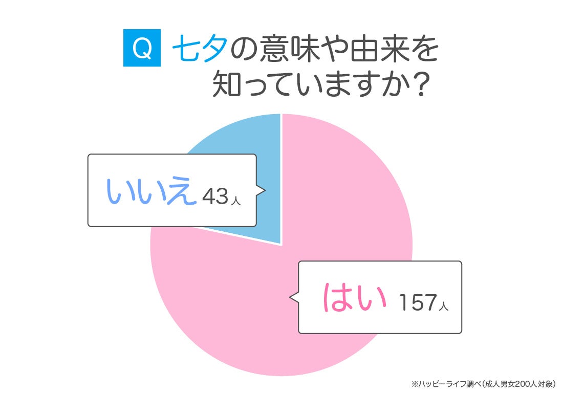 成人男女200人に、七夕の意味や由来を知っているか聞いたところ、「はい」という回答が約8割を占めていました。