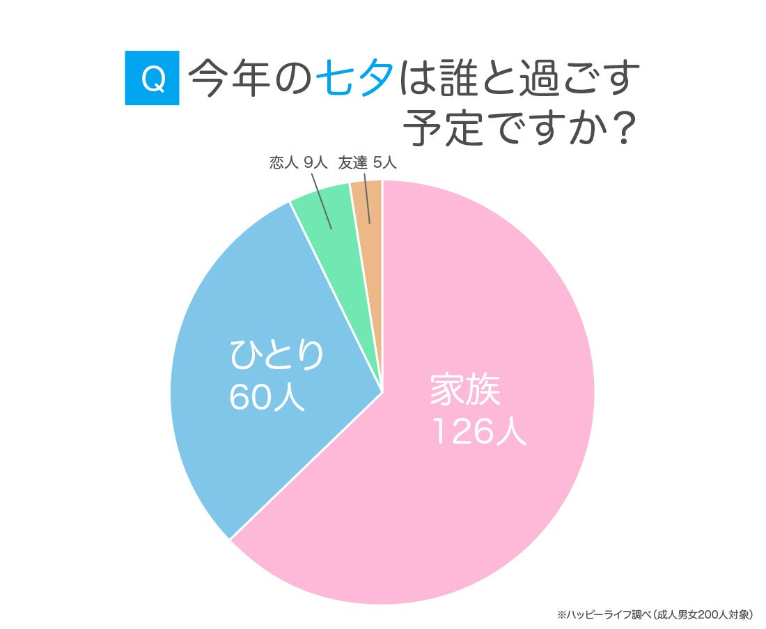 成人男女200人に、今年の七夕は誰と過ごす予定か聞いたところ、「家族」が約6割を占めて最多でした。