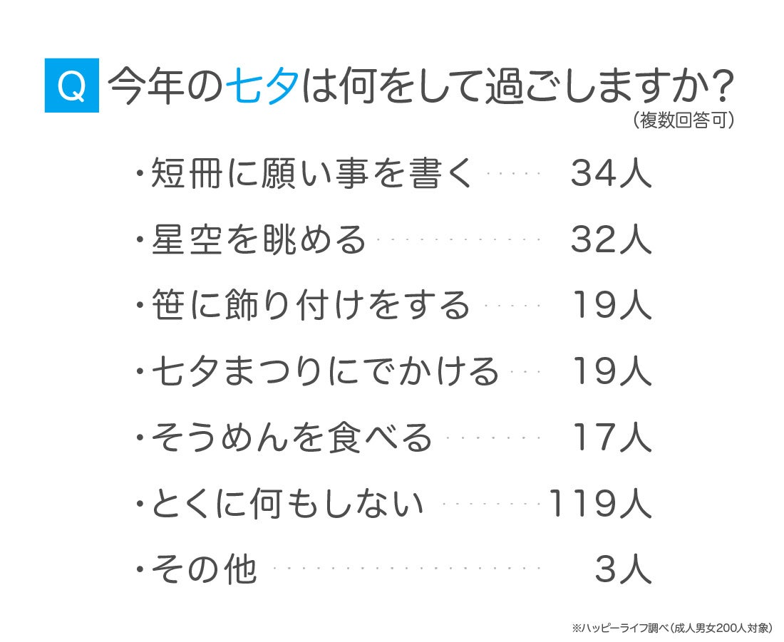 とはいえ、短冊に願い事を書いたり星空を眺めたりする人がそれぞれ2割程度おり、伝統的な風習を楽しんでいる人もいます。