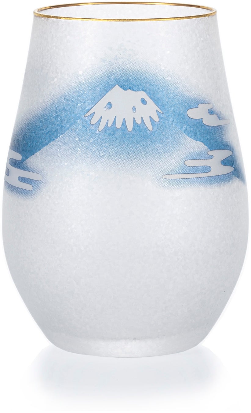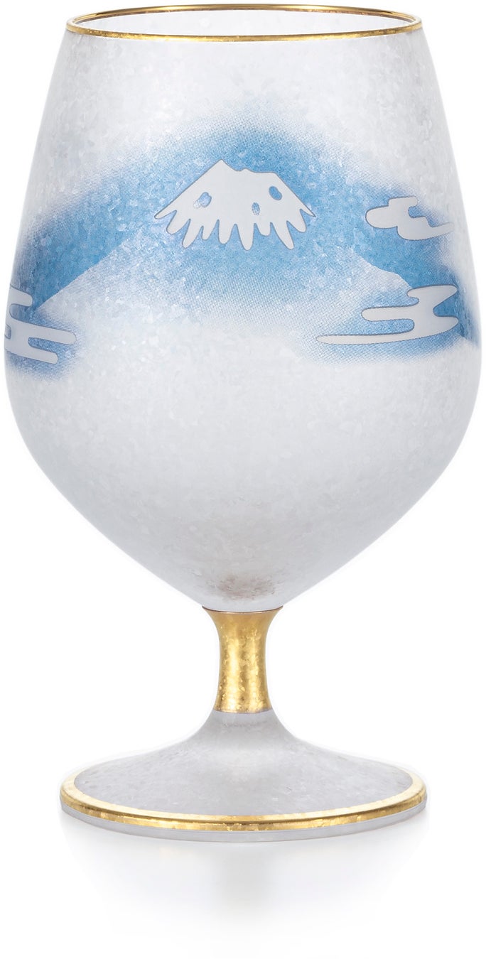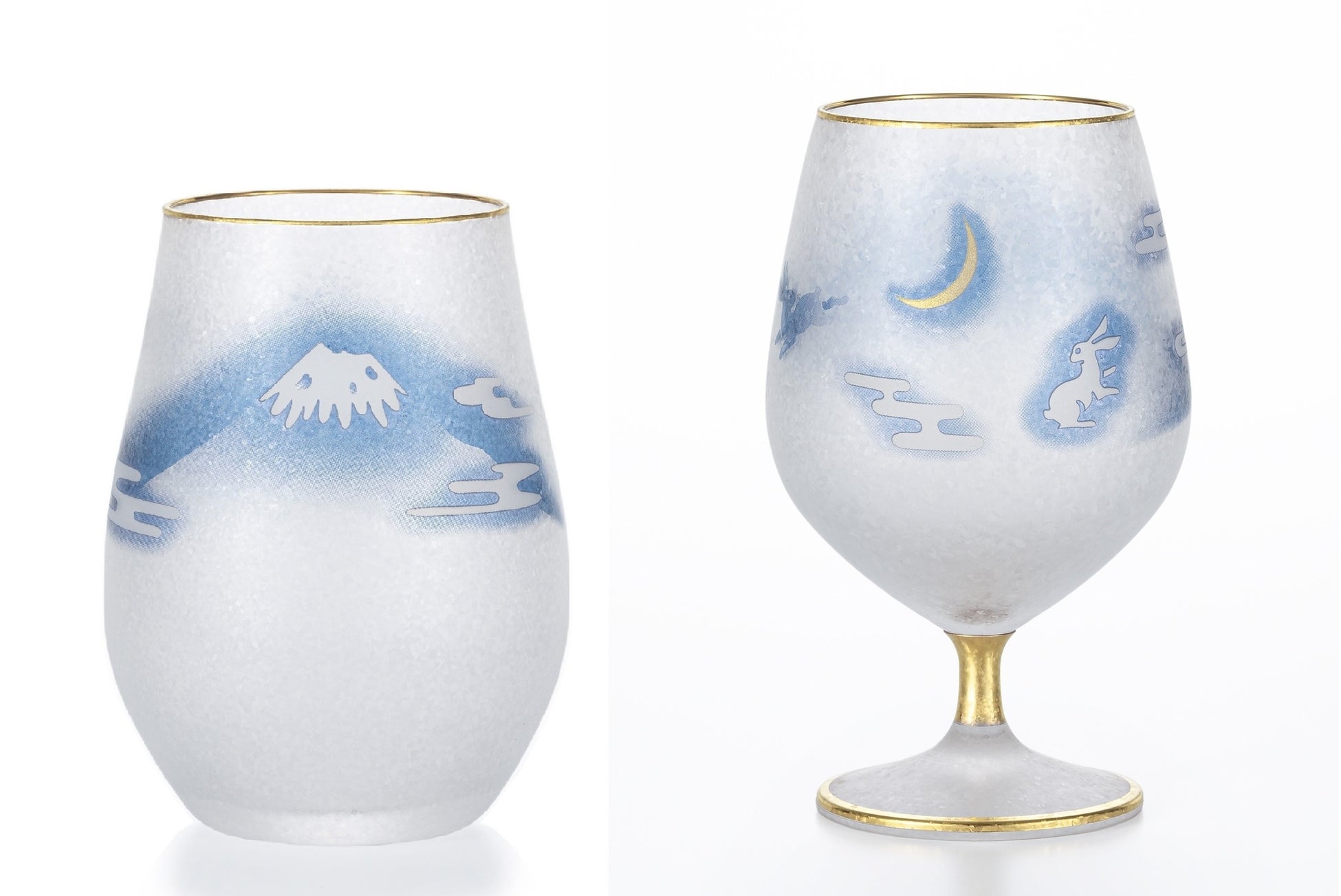 「The Premium NIPPON Taste」は、日本古来の文化や意匠を描いたグラスシリーズ。“みぞれ加工”による煌めくグラス表面に金彩を施したデザインが代表的で、「The Premium NIPPON Taste 富士月兎図」もそのひとつです。シリーズ初となる“富士山”は、江戸時代に中国から伝わった陶磁器の絵付け技法“吹墨(ふきずみ)※1”から着想し、さらに“月兎(げっと)”といわれる月とウサギが描かれた縁起柄を組み合わせることで、ひとつの風景として楽しんでいただけるグラスに仕上がりました。口部や脚部分には職人の手作業による金巻きを施し、高級感を演出しています。