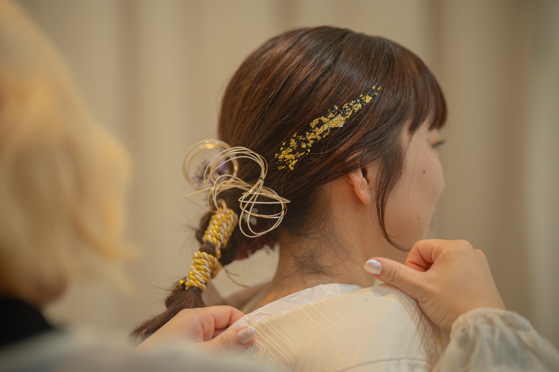 INAI WEDDING WASOU大阪店では、そうした地域の声に応える形で新サービスとして当日着付け枠を設置。スタジオ専属の美容・着付けスタッフが担当し、「苦しくないのに崩れにくい」着付けを実現しました。
