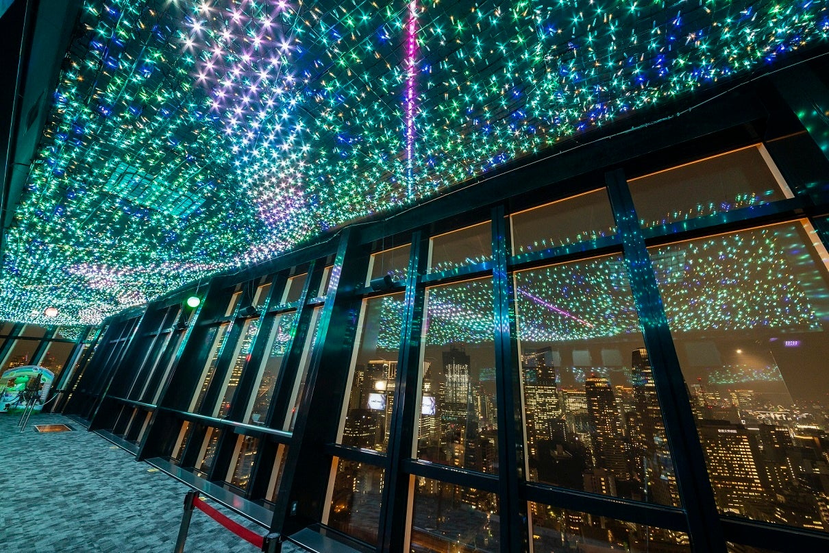 夜が近づくにつれ、メインデッキの窓ガラスに映りこんだ天の川イルミネーションが、眼下に広がるリアルな東京の夜景に溶け込み、まるで本物の天の川が架かったかのような、かがやきの星空世界が広がります。