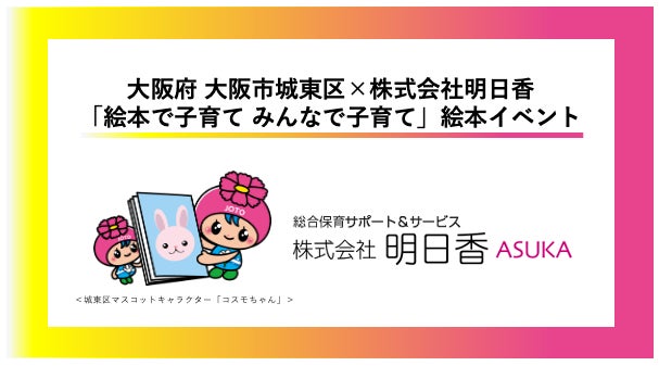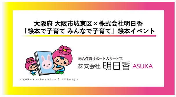 株式会社 明日香(本社:東京都文京区、代表取締役 :萩野 吉俗、以下 明日香)が大阪府 大阪市城東区より運営委託された『「絵本で子育て みんなで子育て」絵本イベント/絵本読み聞かせ会』は、約130名の親子が参加され、 子育て中の親御様が、絵本をきっかけに子どもと一緒に楽しめたことはもちろん、先輩ママやパパとの交流の場にもなり、大変盛況のうちに閉会いたしました。