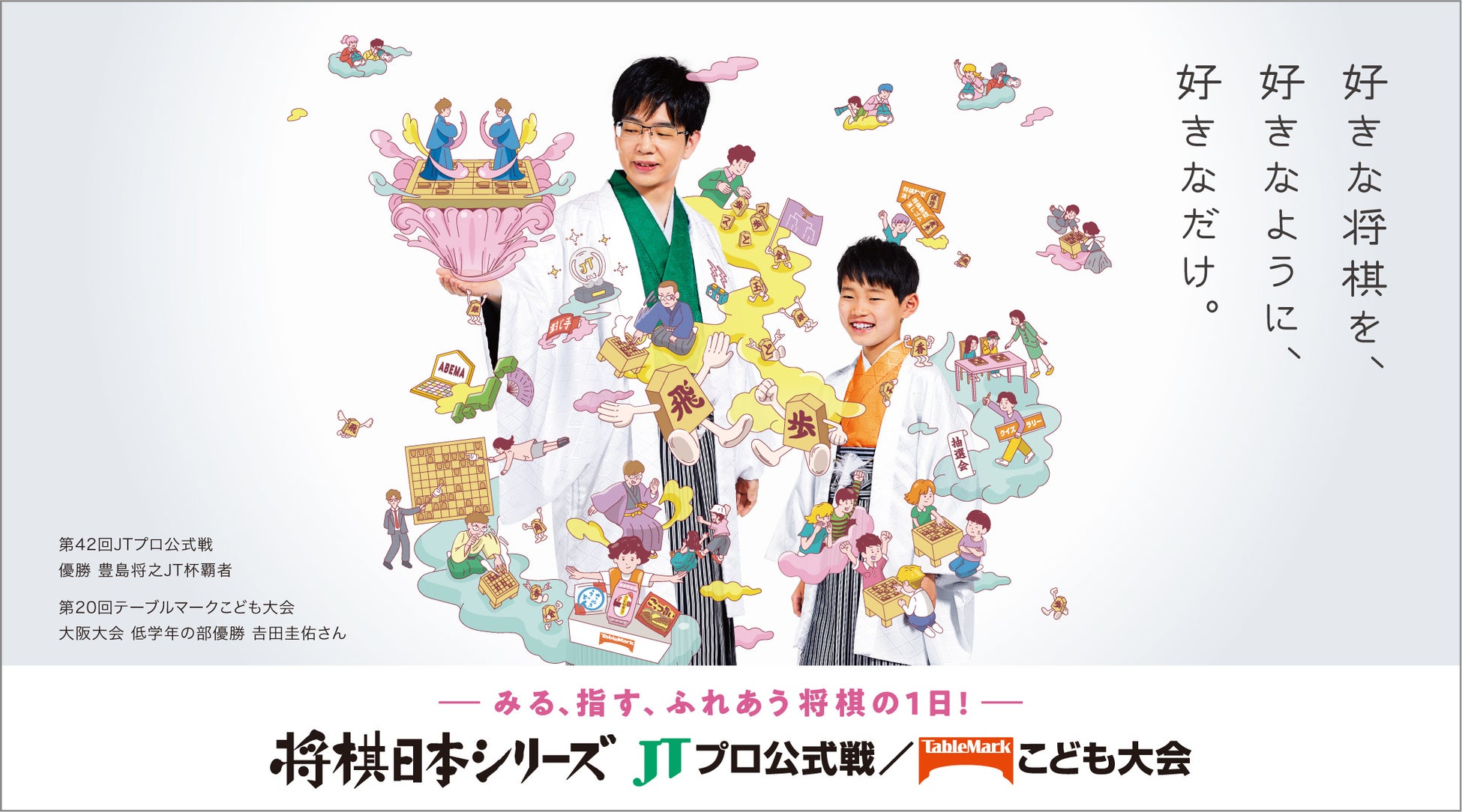 将棋日本シリーズは、今年で43回目の「JTプロ公式戦」と、21回目の「テーブルマークこども大会」が、同日同会場で開催される大会です。「ひとのときを、想う。JT」は、日本の伝統文化である将棋を通じて、一人ひとりに新しい体験をお届けし、将棋を愛するすべての人の心が豊かになるようにとの思いから、大会を応援しています。