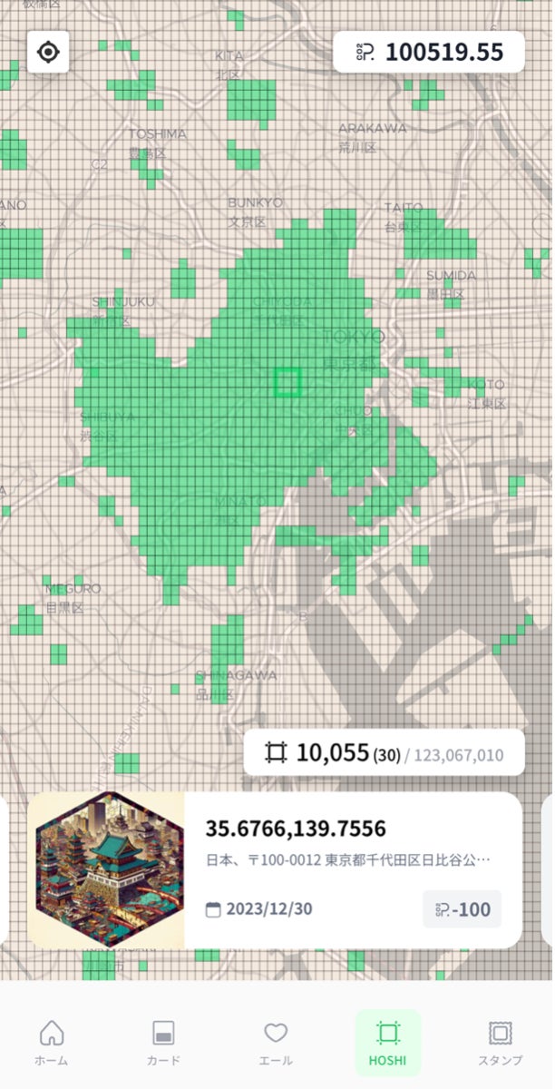 HOSHIのマスを選ぶと、その場所の緯度・経度を自動取得し、そこから住所を自動生成し、その住所近辺の主なランドマークをAIによって取得。弊社独自の画像プロンプト455種類からランダムに描画手法を選択し、住所およびランドマーク情報と組み合わせることで生成AIプロンプトを作り上げ描画しています。生成AIによってその場所にちなんだアートが生成されるたびに、HOSHIがグリーンになっていくことを確認できること、アートが生成されるたびCO2削減のために寄付を行うことから、環境貢献型 生成AIと謳っています(特願2023-156376号、特願2023-156418号)。