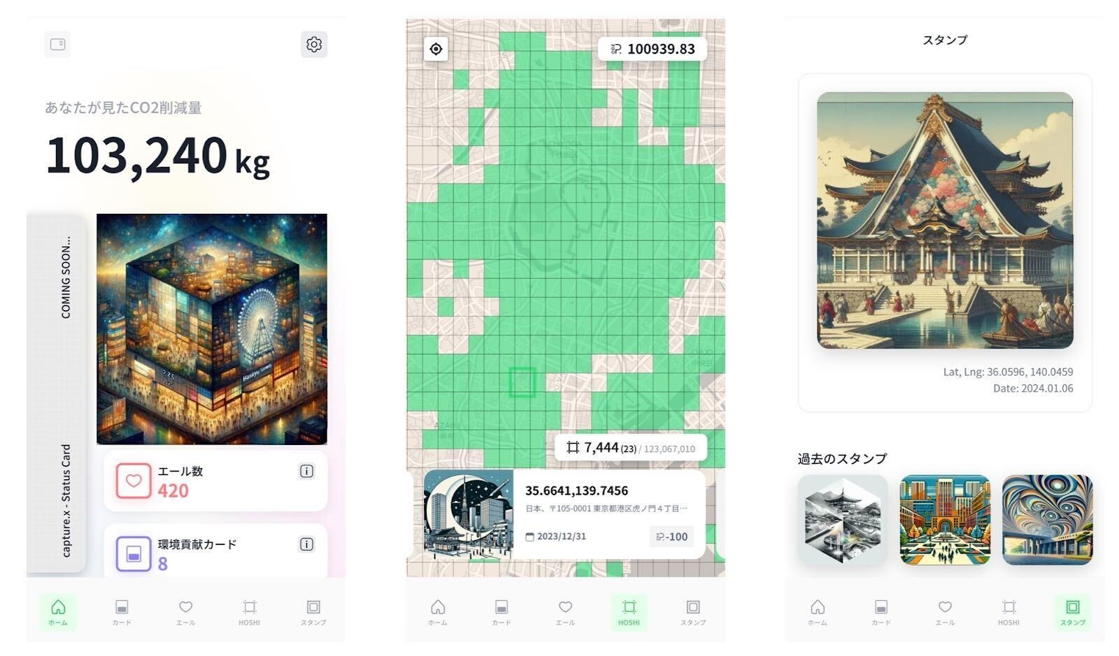 株式会社bajji(本社:東京都台東区、代表取締役:小林慎和)が提供する、環境貢献型 生成AI 「capture.x」(キャプチャーエックス)は、2024年1月9日、スマホアプリ版(iOS, Android)として、v2.0をリリースしました。v2.0では、新たに環境貢献型 生成AIを導入し、脱炭素の進捗を地図をグリーンにすることで可視化したゲーミフィケーションを追加しました。地図をグリーンにするたびに、生成AIが自動で処理したその場所ならではのアートが生成されます。本日1月11日、AIアート生成数が1万回を突破し、ユーザー間で延べ100万トンの二酸化炭素削減が感知されたことになります。