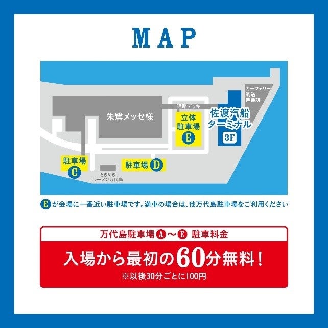 ・万代島駐車場A~Eは入場から最初の60分が無料となります。会場最寄りの駐車場は連絡通路で繋がった立体駐車場Eとなります。