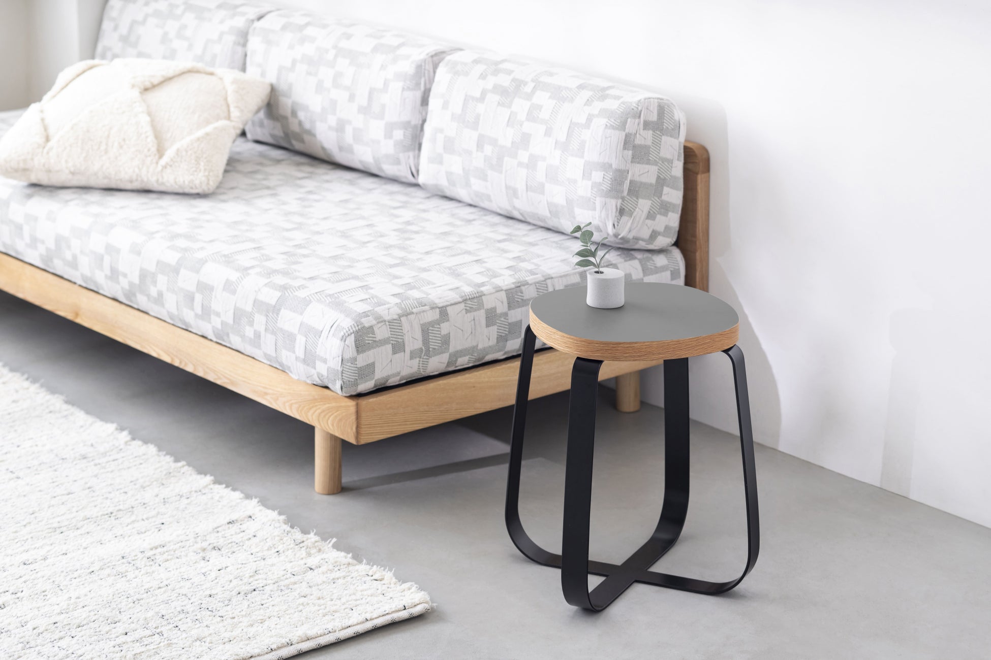 ソファサイドやベッドサイドに一台あると便利。丸みのある柔らかなフォルムのCross Plat脚は、くつろぎの空間にもぴったりです。