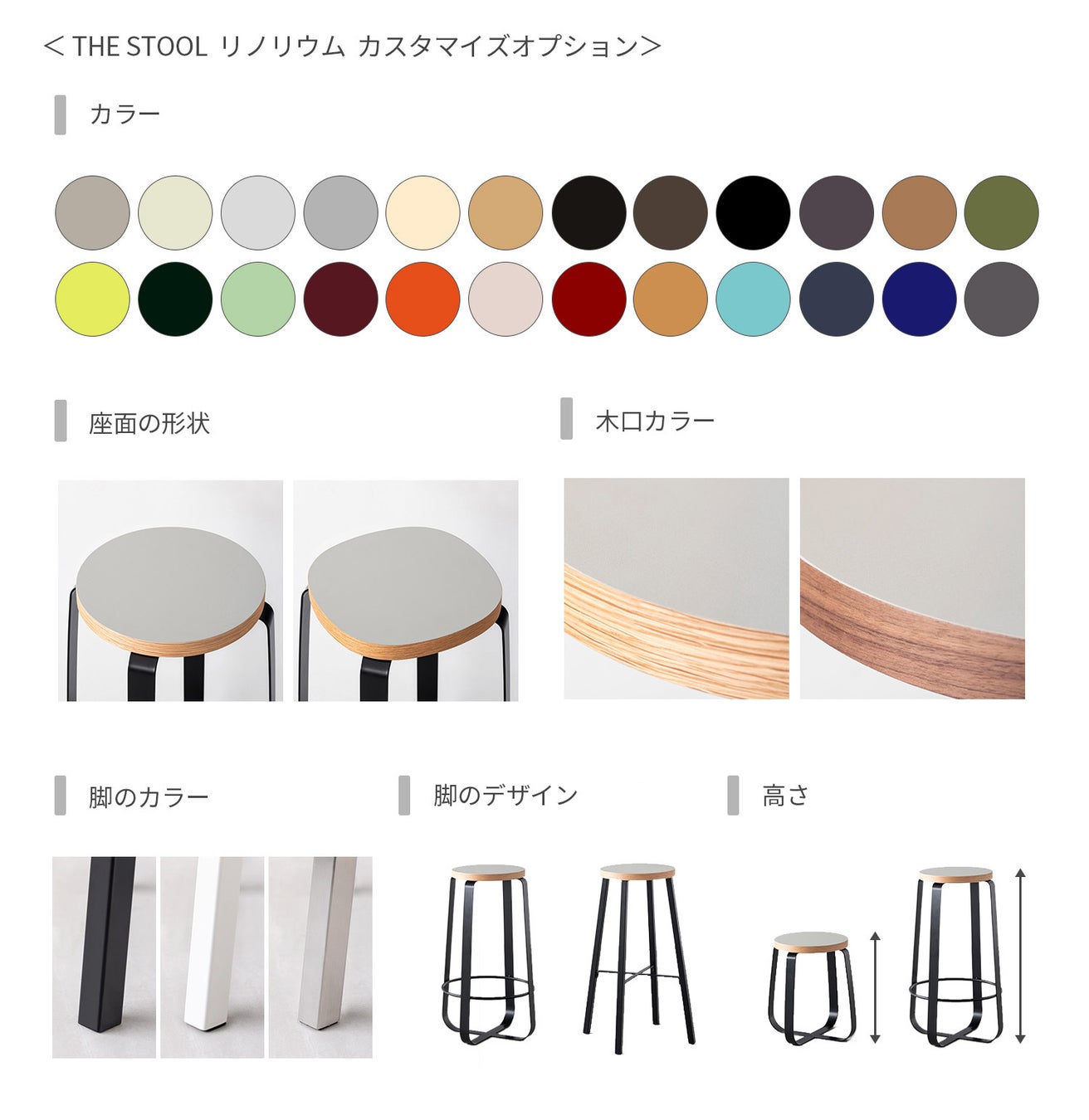 豊富な天板と脚のバリエーション、1cm単位のサイズオーダーが可能なTHEシリーズに「THE STOOL / リノリウム 全24色」が加わりました。