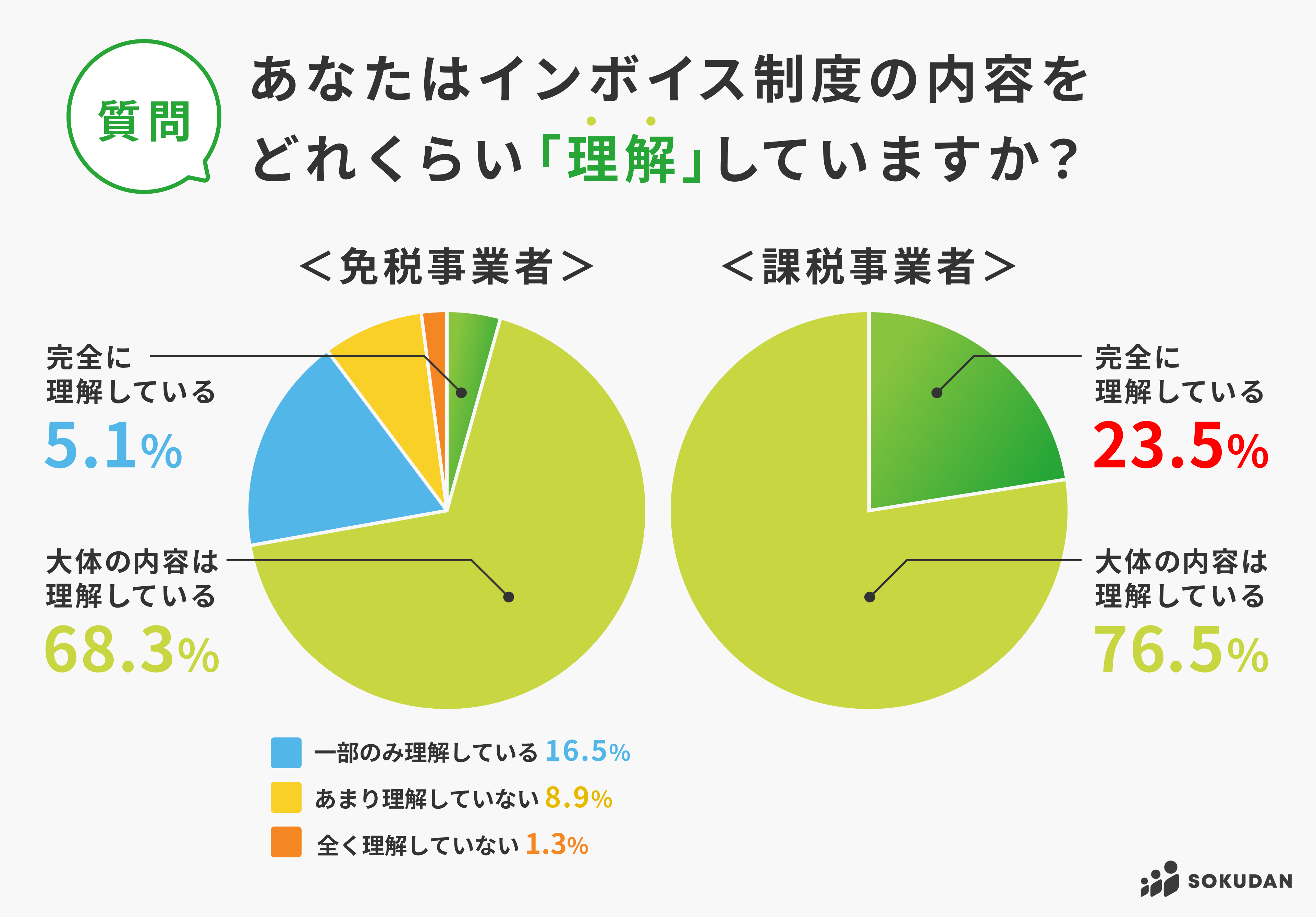 相違点は、「完全に理解している」の回答が、4倍以上も免税事業者より課税事業者の方が多い点です。(課税事業者23.5%・免税事業者5.1%)