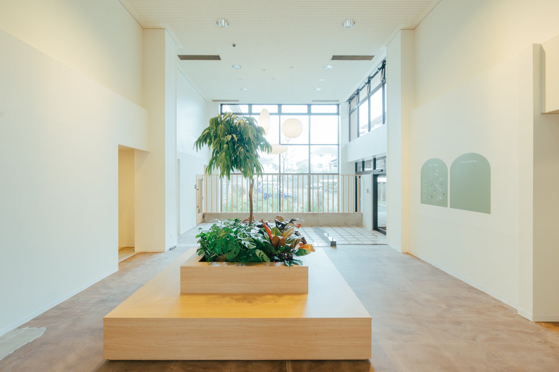 大きな緑が迎え入れるエントランスや共用のラウンジ、内廊下、壁に描かれているサインも緑で統一し、心安らぐ空間となっております。