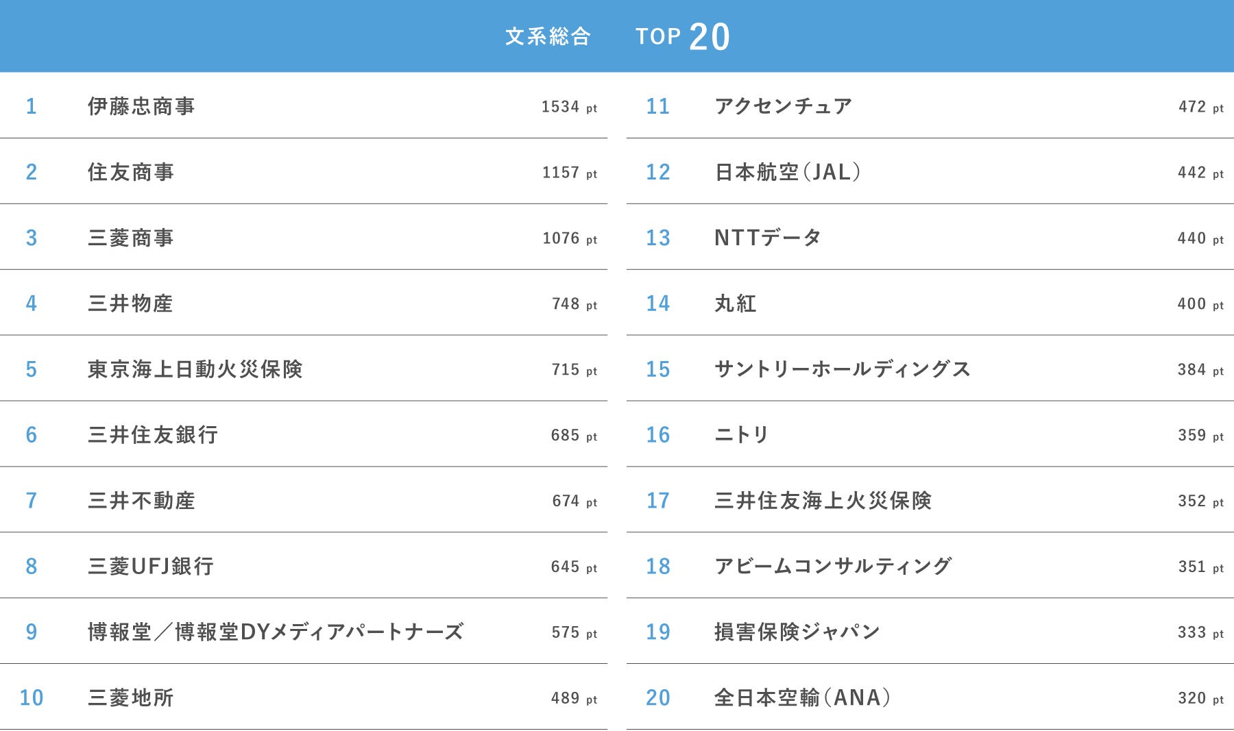 文系総合ランキングで昨年から引き続き1位となったのは、伊藤忠商事。2位に住友商事、3位に三菱商事、4位に三井物産がランクインし、総合商社が上位を占める結果となった。