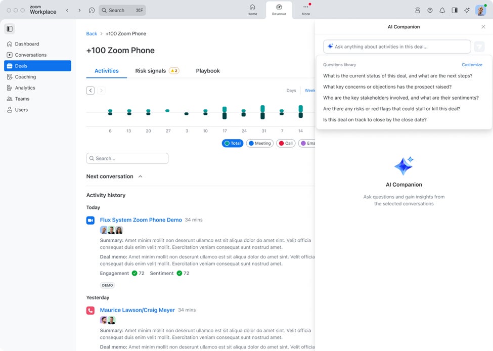さらに、Zoom Revenue Accelerator の deal explorer の導入により、営業チームは自然言語クエリを通じて重要な営業のインサイトを抽出できるようになります。deal explorer は、案件のライフサイクル全体にわたる情報を集約し分析することで、複数のデータソースを手動で選別する必要性を排除します。これにより、営業担当者は貴重な時間を節約し、営業の実行力を改善し、より自信を持って取引の成立に集中できるようになります。