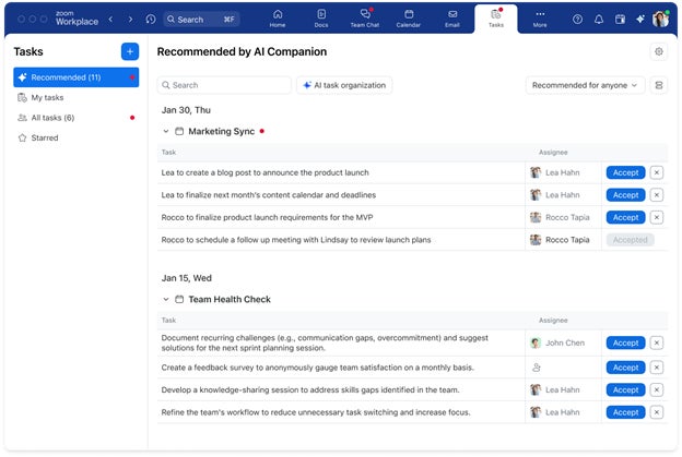 ミーティング、メール、チャット、通話など、あらゆる手段で情報が飛び交う中、チームや個人はすべてのタスクを把握しきれず、負担を感じることがあります。AI Companion を活用した Zoom Tasks は、Zoom Workplace 全体でタスクの表示、管理、完了を支援し、より多くのタスクを完了できるようにします。また、一元化されたタスク管理タブですべてのタスクをまとめたり、タスクを Zoom Doc に埋め込んで簡単に追跡することもできます。