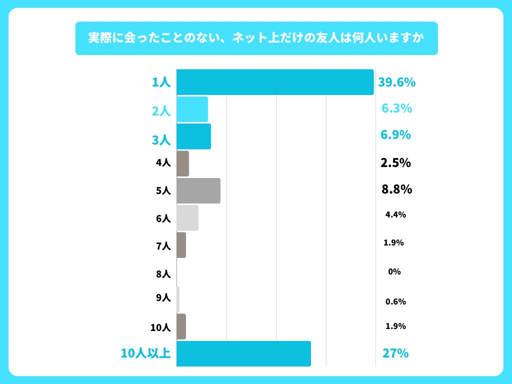 実際に会ったことのないネット上の友人が10人以上いるのは27%と、オンラインとオフラインの境界がより曖昧に