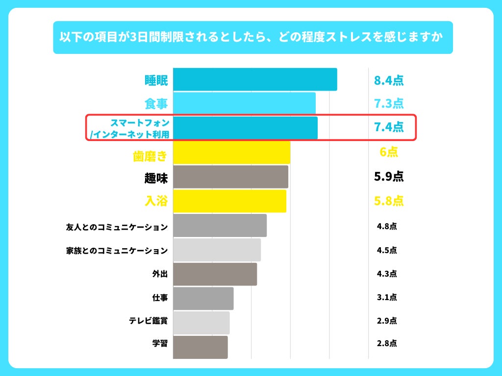 3日間の利用制限時のストレス度を比較した結果、スマートフォン利用(7.4点)は、食事(7.3点)、歯磨き(6点)や入浴(5.8点)と同等以上のストレス要因