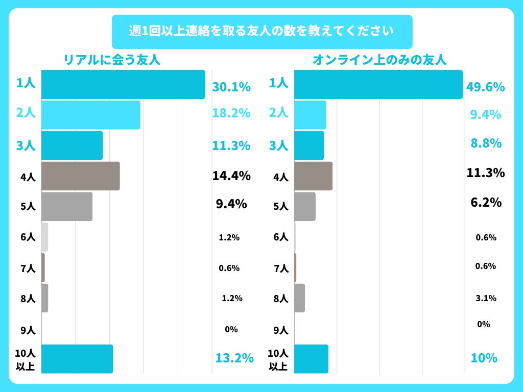最後に、週1回以上連絡を取る友人の数を調査したところ、リアルでもオンラインでも「1人」という回答が最も多く見られ、それぞれ約30.1%と約49.6%を占めています。一方で、リアルな友人関係においては、2-4人程度の小グループでの交流が比較的一般的である一方、オンライン上での交友関係は「1人」もしくは「10人以上」という極端な二極化の傾向が見られます。この傾向は、一対一でのダイレクトメッセージのやり取りやSNSコミュニティでの交流など、オンラインコミュニケーション特有の性質を反映していると考えられます。
