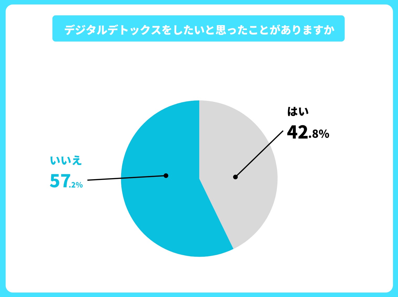 デジタルデトックス(一定期間スマートフォンやパソコンなどのデジタルデバイスとの距離を置くこと)への意識について尋ねたところ、デジタルデトックスを希望する回答者は42.8%でした。