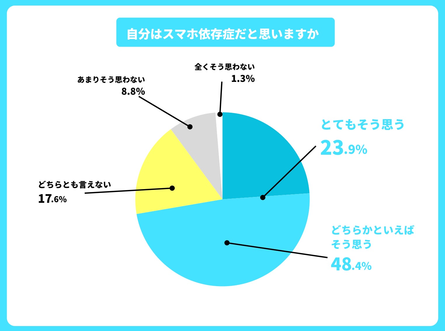はじめに、自身がスマートフォン依存症だと思うかについて尋ねたところ、「強くそう思う」(23.9%)と「ややそう思う」(48.4%)を合わせて72.3%が依存傾向を自覚していることが判明しました。