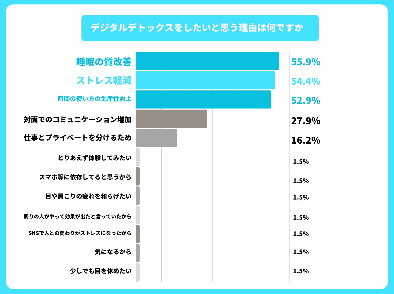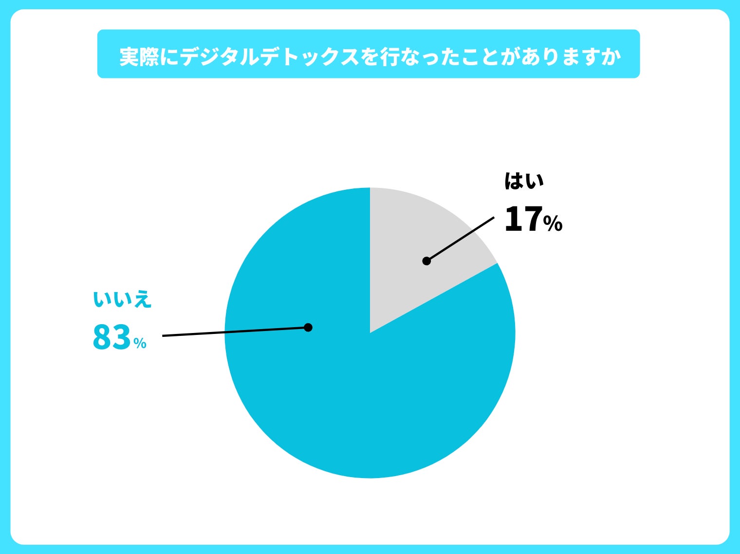主な理由としては、睡眠の質改善(55.9%)やストレス軽減(54.4%)、時間の使い方の生産性向上(52.9%)などが挙げられました。一方で、実際にデジタルデトックスをしたことがあるのは17%に留まりました。