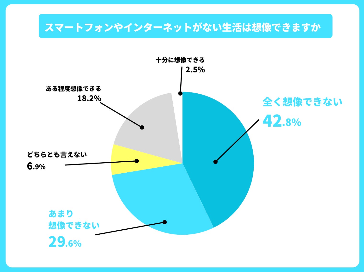 そこで、インターネットのない生活についてどう思うか尋ねたところ、「全く想像できない」(42.8%)、「あまり想像できない」(29.6%)を合わせて72.4%が想像できないと回答。デジタルが当たり前の生活スタイルであることが明らかになりました。