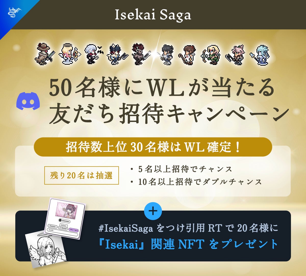 『Isekai Saga』公式Discordに参加し友だちを招待していただいた方の中から、招待数上位30名はWL確定(ゲーム内で使用できるキャラクターの先行購入権利)、5名以上招待していただいた方の中から抽選で10名、10名以上招待していただいた方の中からさらに10名、合計50名にWLをプレゼントいたします。