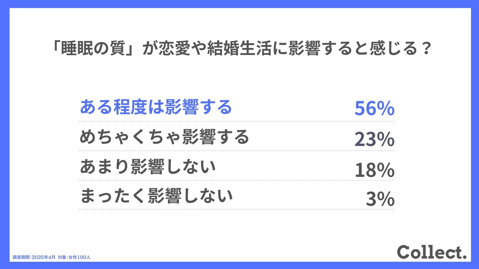 「ある程度影響する」(56%)、「めちゃくちゃ影響する」(23%)で、約8割が“睡眠の質”が恋愛や結婚生活に影響をあたえると考えているようです。