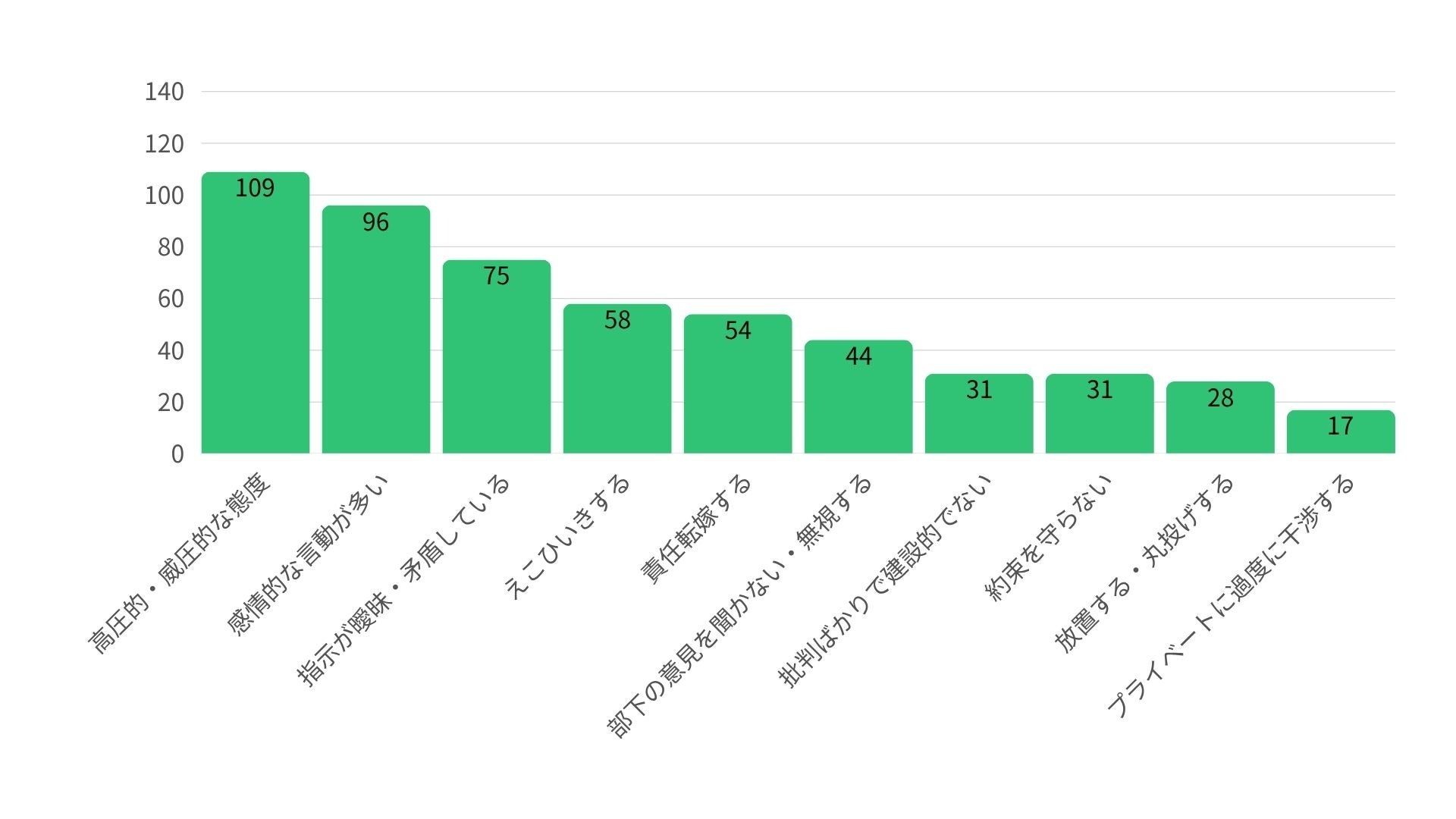 調査の結果、「高圧的・威圧的な態度」(61.9%)、「感情的な言動が多い」(54.5%)が過半数を超え、トップ2を占めました。スキルや経験以前に、人としてのリスペクトの欠如や、心理的安全性を損なう言動が最も敬遠されることが示唆されます。次いで「指示が曖昧・矛盾している」(42.6%)が3位となり、上司としての基本的なマネジメント能力も厳しく評価されている実態が明らかになりました。