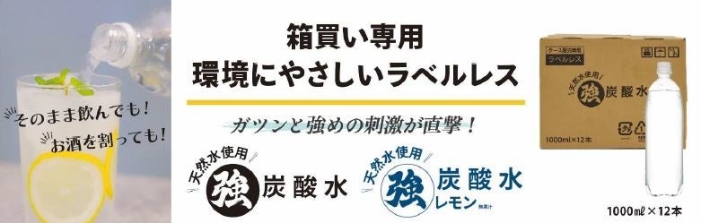 また、パッケージは「ラベルレスボトル」とし、ラベルを剥がす手間と環境負荷の低減を実現、さらに自社の販売データから近年、コロナ禍による炭酸水のまとめ買いの需要が多いことから、本来ラベルに記載すべき製品情報はケース箱(ダンボール箱)に記載して、ケース販売とすることでお求めやすい価格を実現しました。
