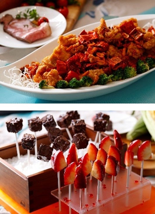 その他、サラダには今旬な「湘南しらす」のサラダや、カハラハワイのシグネチャーメニュー「カハラチキンサラダ」、日本料理 濱の鰹だしをベースに和牛を惜しみなく使用し、7種類の薬味をぜいたくにトッピングした「和牛濱カレー」。デザートには、夏祭りの縁日に必ず登場する「りんご飴」を一口サイズで何本でも楽しめるちょうど良い甘さに仕上げた、愛らしくかわいらしい「りんご飴」など、バラエティーに富んだメニューが登場します。