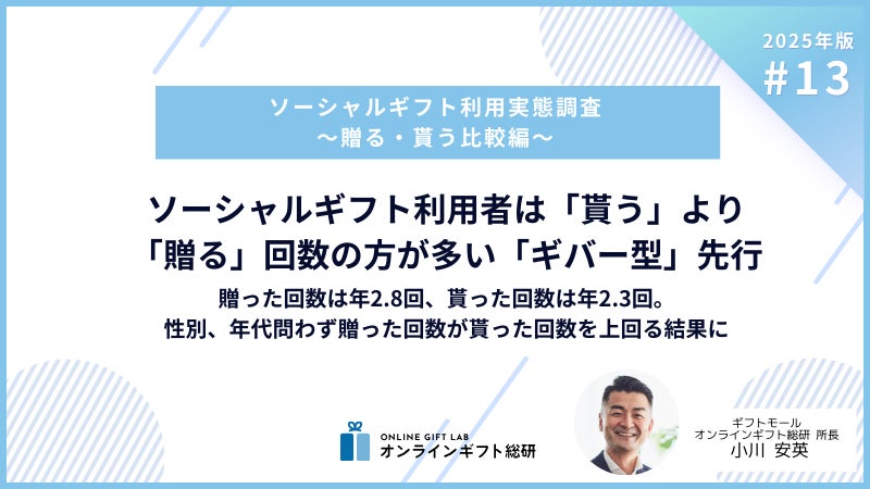 オンラインギフトサービスを通じた幸福度の高い世の中の実現を目指す「ギフトモール オンラインギフト総研」(https://giftmall.co.jp/souken/)は、近年増加する「ソーシャルギフト」の動向を踏まえ、ソーシャルギフト利用経験者に特化した実態調査を実施いたしました。全国の15歳〜59歳の男女、合計2,250人(2024年7月からの1年間にギフト購入経験があり、ソーシャルギフトを贈った・受け取った経験がある人)を対象とした本調査の結果を、全16回にわたって順次発表するレポートのうち本レポートは第13回目の発表となります。