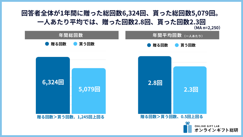 贈った回数は年2.8回、貰った回数は年2.3回。性別、年代問わず贈った回数が貰った回数を上回る結果に