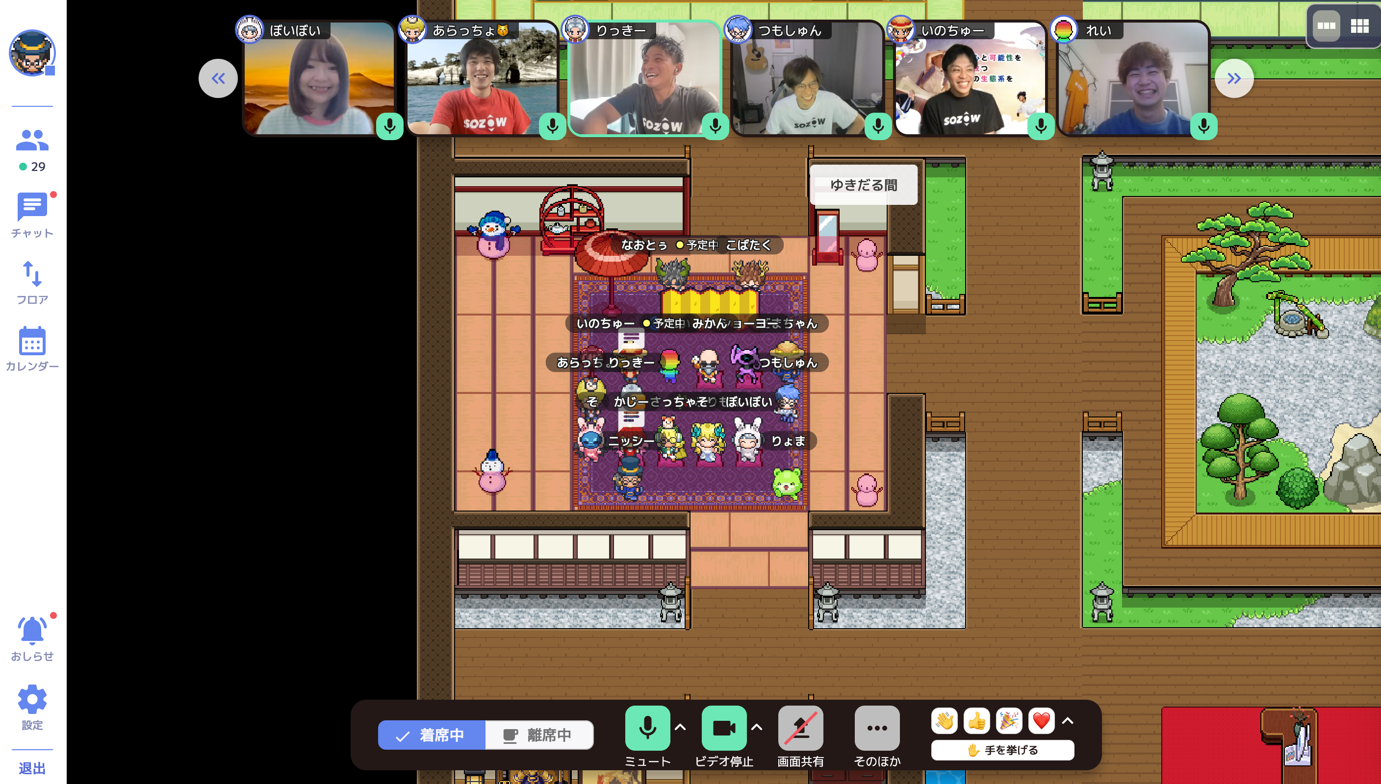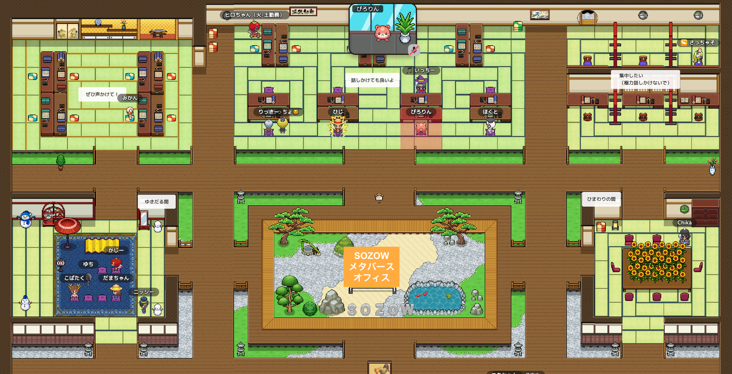 SOZOWのメンバーはアバターとなってオフィスに入り、アバター同士が近づくとカメラが起動して互いの顔を見ながら会話ができます。ミーティングルームや、個人ワークに集中するスペース、雑談したり交流できるスペースなどを設け、リモートワークでも社員のコミュニケーションが円滑に進むような勤務環境を整えています。