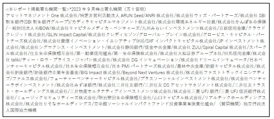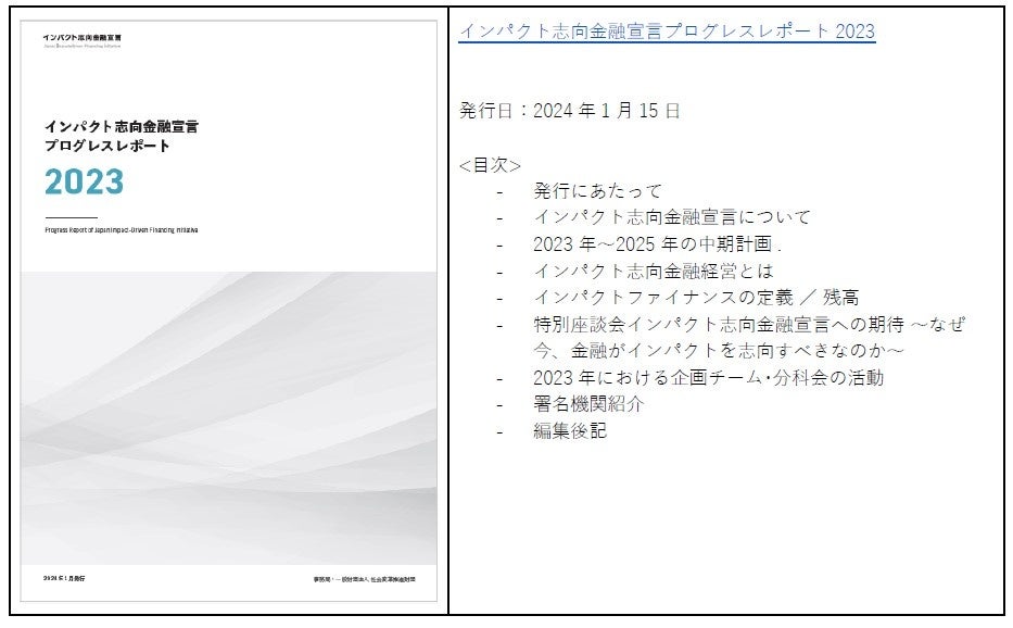 また、レポートでは、高倉透三井住友トラスト・ホールディングス株式会社取締役執行役社長、清水博日本生命保険相互会社代表取締役社長社長執行役員、田代桂子株式会社大和証券グループ本社取締役兼執行役副社長による特別座談会「インパクト志向金融宣言への期待~ なぜ今、金融がインパクトを志向すべきなのか~」の報告を掲載するほか、署名機関・賛同機関の個社のインパクト志向金融経営の取り組みを紹介しています。