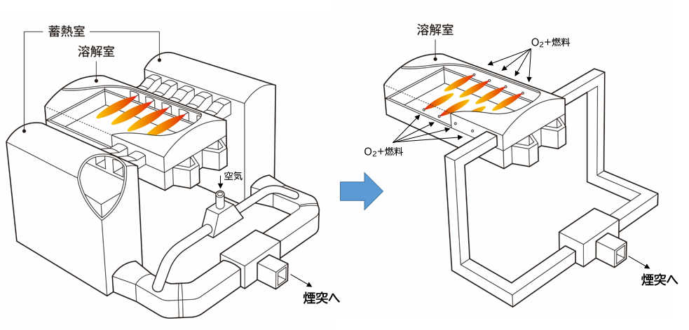 国内のガラスびん用大型溶融窯は空気燃焼方式ですが、ガラス溶融の燃焼で使用する空気には約80%の窒素が含まれ、この窒素はガラス溶融の伝熱に寄与せずに排ガスとなっています。そのため、窒素を含む空気燃焼には無駄なエネルギーが必要となり、温室効果ガス(以下「GHG」)削減に対して大きな阻害要因でした。