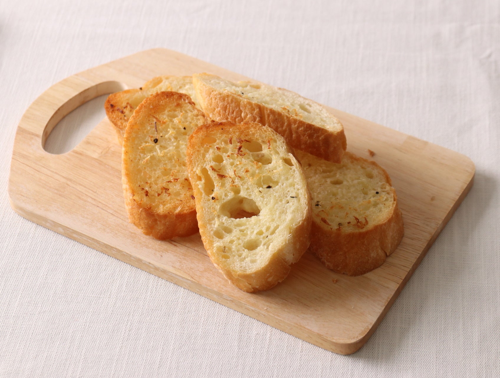 付け合わせにぴったりのバゲットは、オリーブオイルを絡めてトースターでこんがりと。仕上げに『クレイジーソルト』を振りかけると、6種のハーブ&スパイスがほのかに香り、おかわり必須の一品になります。主食やおやつに普段使いで気軽に楽しんでください。