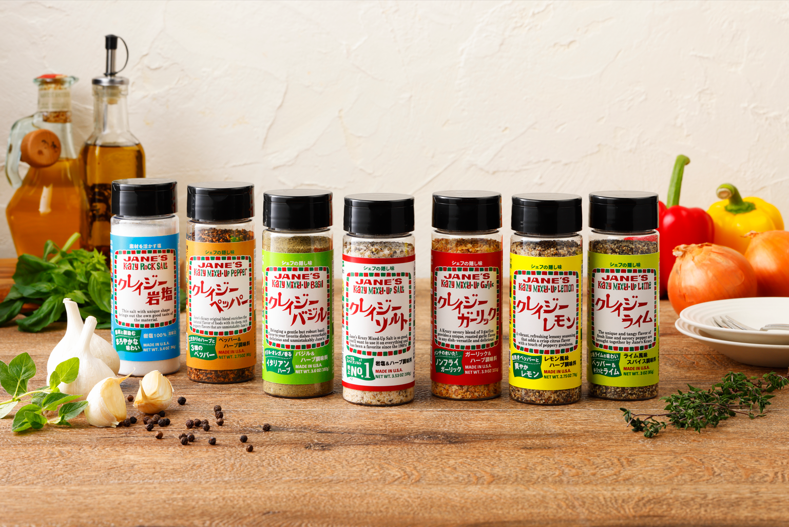 「クレイジーソルト」シリーズは、現在、『クレイジーソルト』、『クレイジーガーリック』、『クレイジーペッパー』、『クレイジーレモン』、『クレイジーバジル』、『クレイジーライム』、『クレイジー岩塩』の7種類のフレーバー。2020年にはオーガニック版も発売。