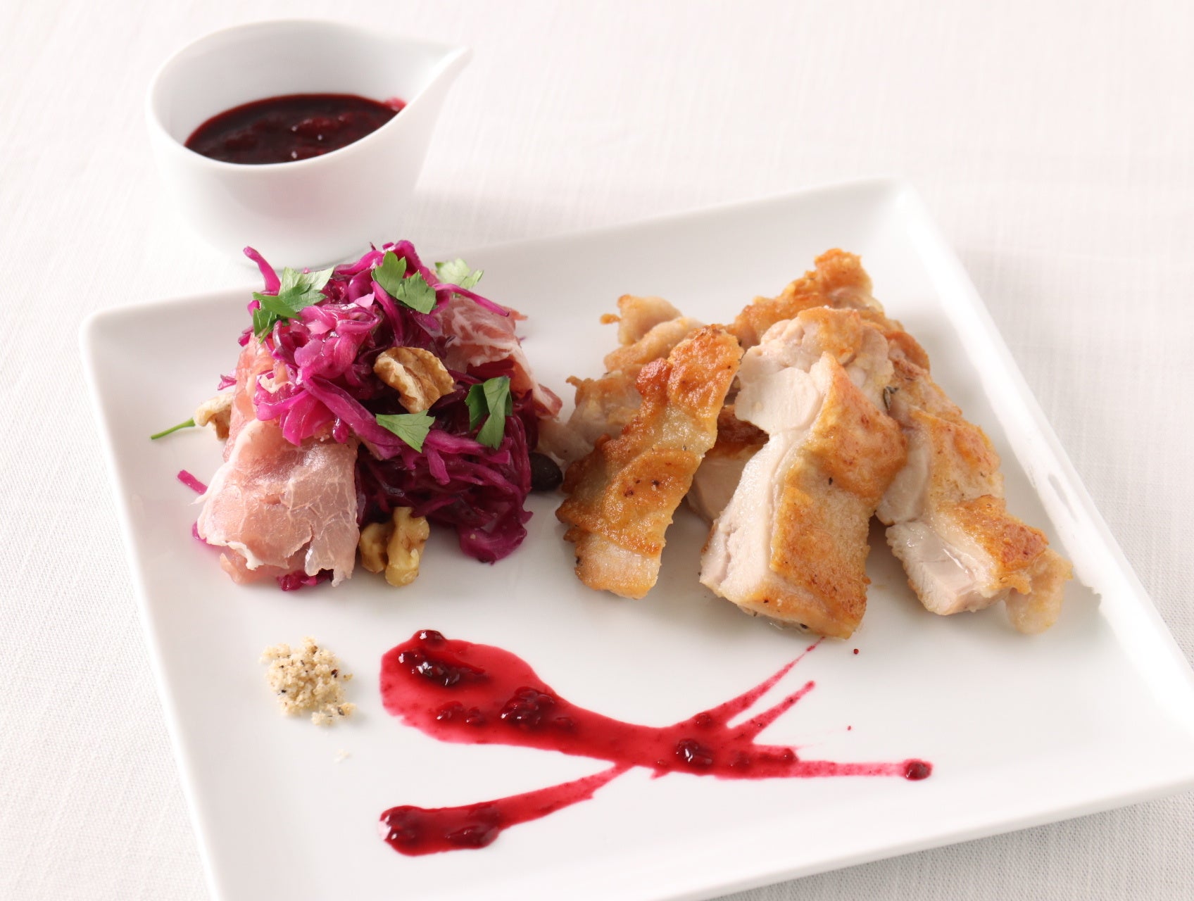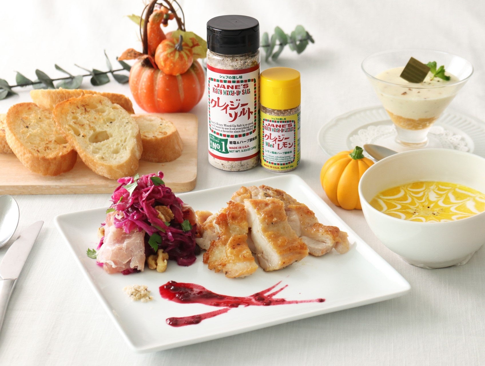 甘酸っぱいベリーソースと、6種のハーブ&スパイスとオニオンがブレンドされた『クレイジーソルト』の組み合わせは、初めて出会う魅惑の味。定番レシピになりそうなやみつきになる一品に。