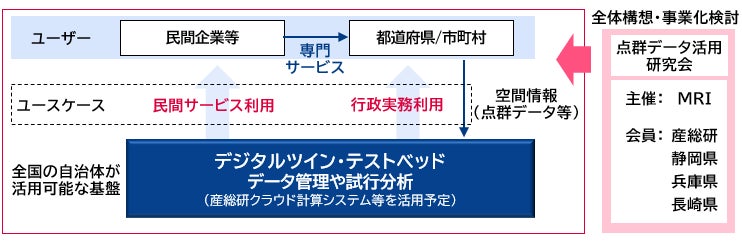 MRIは、産総研および興味関心の高い自治体の参画を得て「点群データ活用研究会」(以下 研究会)を設置、主催します。研究会では、点群データの活用による自治体業務の効率化・高度化を目指し、自治体が抱える課題を解決するためのさまざまなユースケースを検証、具体化、発信することを目指しています。