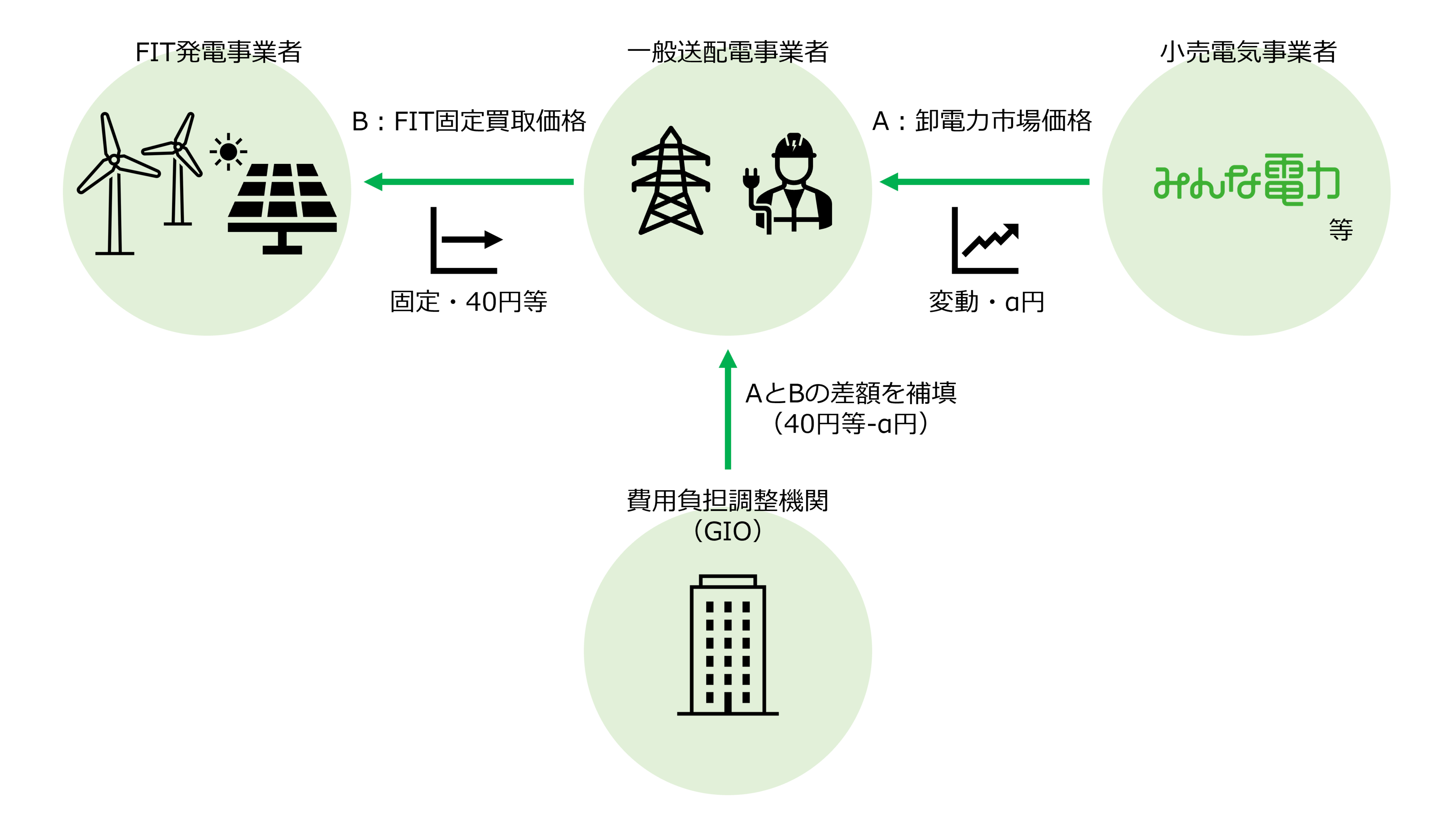 当社は「顔の見える電力™」のコンセプトの下、全国の再エネ発電所と直接契約し再エネ電力を中心に調達しています。本来再エネ電源の発電コストはエネルギー資源価格の影響を受けませんが、再エネ電力のうち、「固定価格買取制度(FIT)」によって発電されたFIT電気については、国のルールにより卸電力市場の取引価格に連動した調達価格が設定されているため、卸電力市場の価格変動リスクを抱える仕組みとなっています。