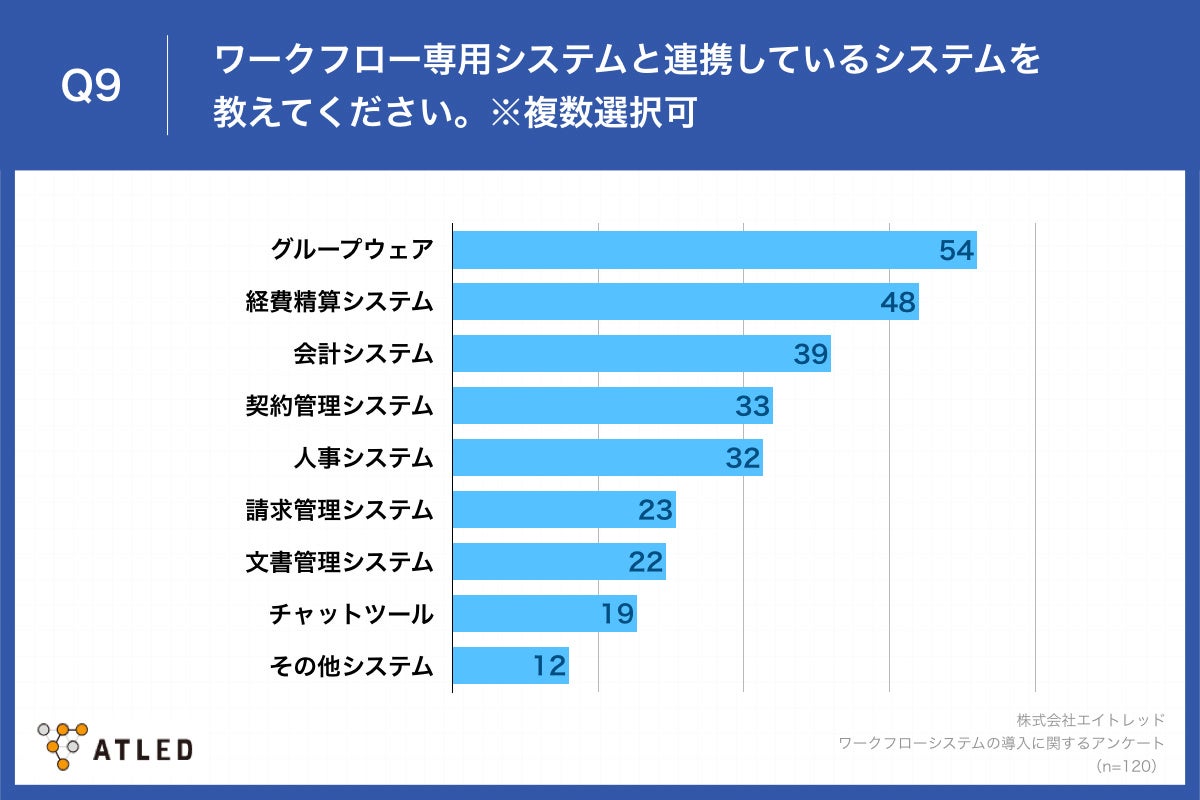 「Q9.ワークフロー専用システムと連携しているシステムを教えてください。※複数選択可」と質問したところ、「グループウェア」が54票で最多という回答となりました。