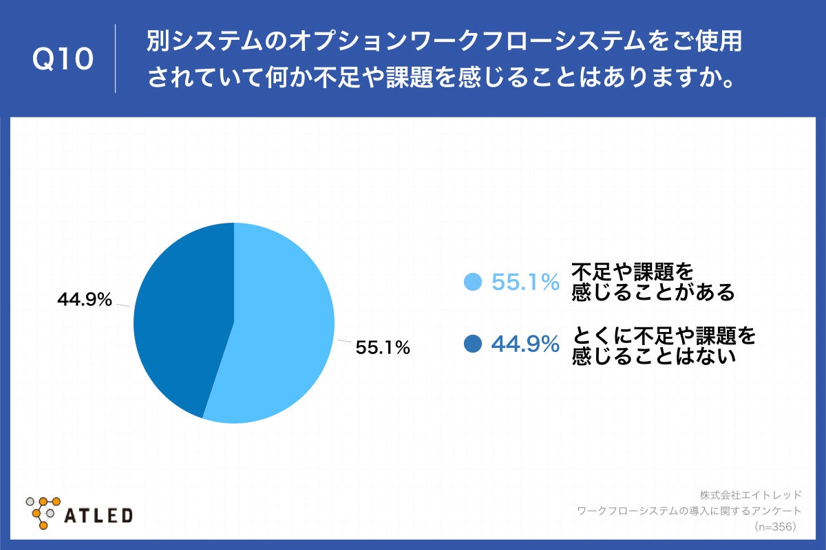 「Q10.別システムのオプションワークフローシステムをご使用されていて何か不足や課題を感じることはありますか。」と質問したところ、「不足や課題を感じることがある」が55.1%、「とくに不足や課題を感じることはない」が44.9%という回答となりました。